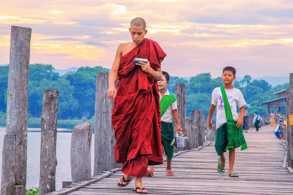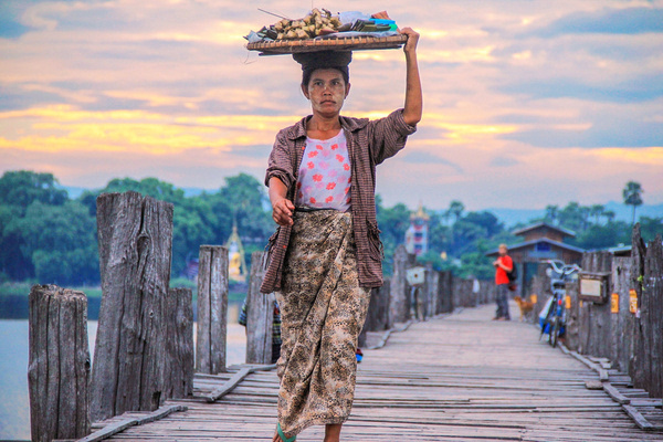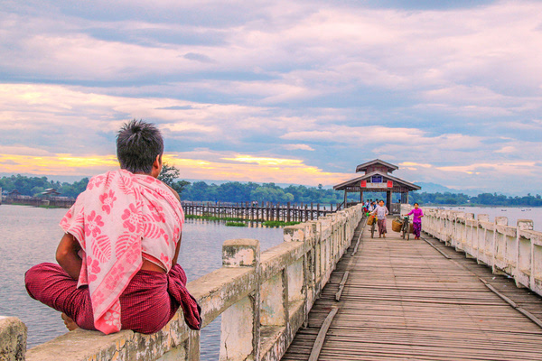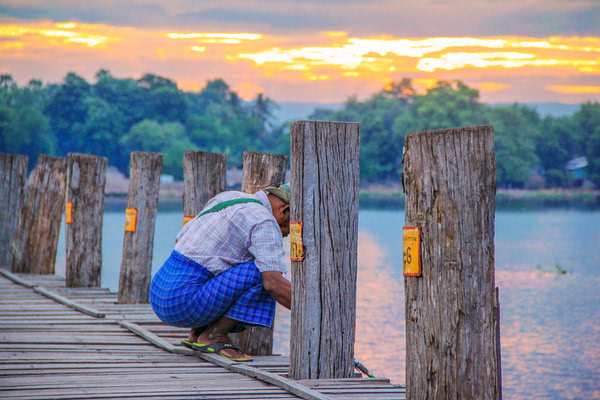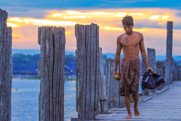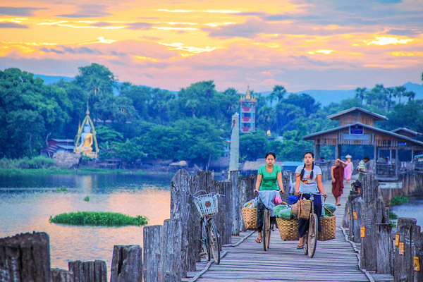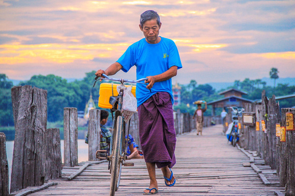 当地人骑车自行车往来乌本桥,估计也只要在这个时候他们才可能如此毫无顾虑的骑着自行车,若是在傍晚,他们只能推着自行车行进。