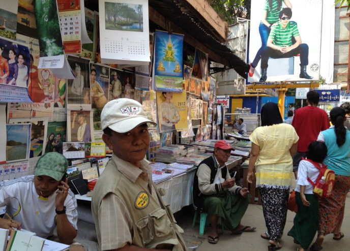 在书摊上,有好几种昂山素季(现任缅甸全国民主联盟(民盟)主席)的贴画,在缅甸,昂山素季那漂亮自信,富有领国风范的肖像画一般都是书摊上的主角,看得出来,缅甸人民很喜欢她。