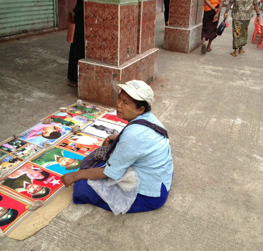 连地摊上的画册,都是昂山素季和她父亲(被缅甸人尊为国父的昂山将军),20年来的软禁,没有换来缅甸人民对昂山素季的遗忘,反而给人民更大的信心。听闻此时的她,现已当选缅甸的国会议员,美国也为此,要解除对缅甸的经济制裁,缅甸,一切利好的消息似乎因她而来,所以,市井人民的爱戴和拥护,才是基石,才是真正的载舟之水。