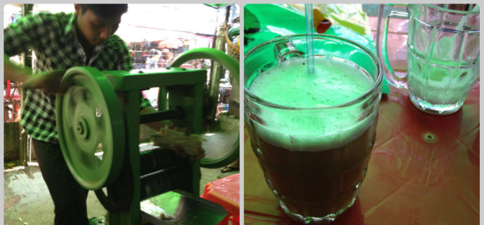 我们看到一个超级震撼的大家伙,手动甘蔗机,因为好奇他怎么操作,便请店主给我们做一杯,过程竟然“恐怖”至极,只见他拿一根甘蔗弄断成几节,也没洗手,一只手连续转动机器的轮子,榨汁机随即发出“咯嘎咯嘎”的声响,一手抓住甘蔗放进滚动的铁柱中间,甘蔗被碾压出汁,以为这样就好,没想到他抓着已经压过的甘蔗来回的压了几次才算完。