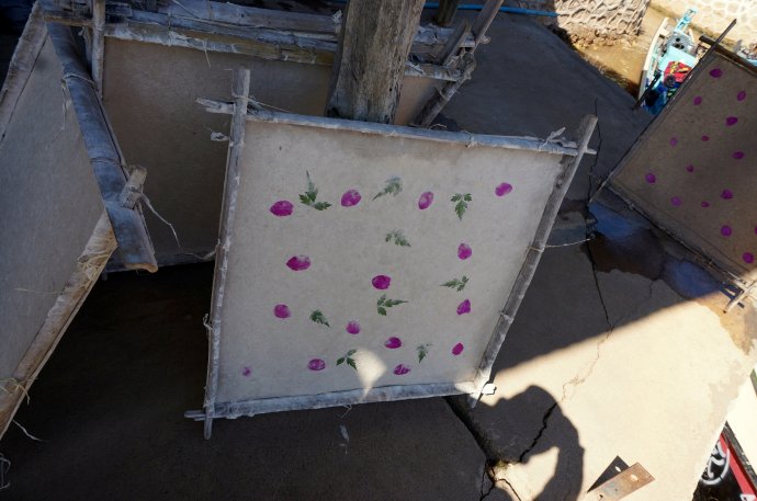 一把漂亮的油纸伞,要经过几十道工序才能制成。先是制作麻纸穰料,将树皮经过侵泡,捣成麻粕。再将麻粕经加工成纸浆。再经过打馅、抄纸、扫纸、凉晒等工序,制成白麻纸。再在白麻纸上印花,再抄纸、扫纸、凉晒,制成做伞用的印花麻纸。
