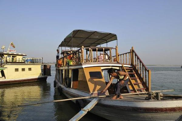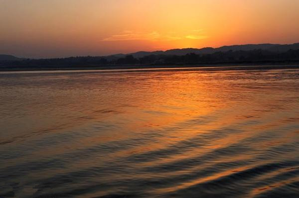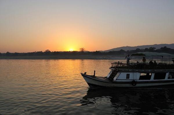 离开了敏贡,乘船返回,这时候的天空已经被晚霞染的绚烂夺目。我们的船拉了几声汽笛,便缓缓的起航了,伊洛瓦底江的水面依旧如下游一般的平静,轮船驶过,在水面上泛出了阵阵的波纹,金黄的颜色与天空辉映一体,远处的群山渐渐往身后退去。船工是一家人,这艘游船是他们赖以生活的产业,一位年轻的船工骑坐在栏杆上望着远方,这幅画面实在是让人着迷的。
