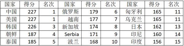 2019年国际奥数比赛于7月16日、17日在英国巴斯市举行,中国、美国双双获得第一,各国的得分成绩如下: