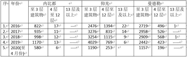 建筑物的建筑许可证(Permit)的批发情况,以下是历年来内比都、仰光、曼德勒三大城市所批发的建筑物的建筑许可证数量表。