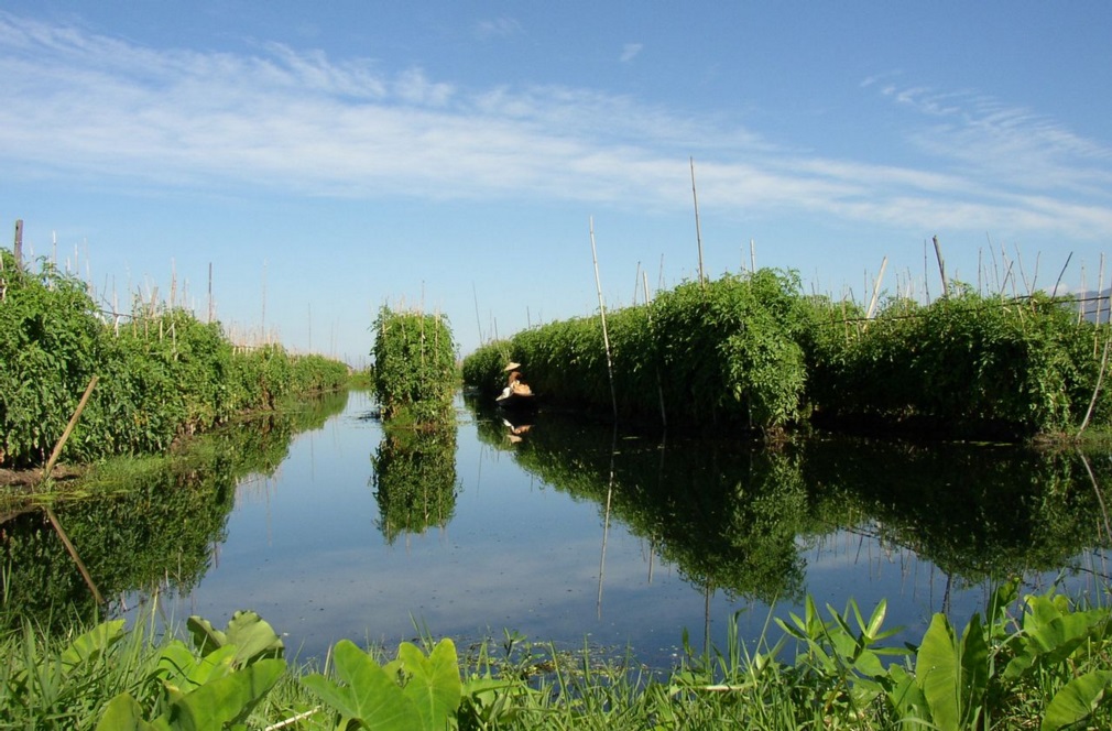 茵莱湖位于缅甸北部掸邦高原的良瑞盆地上,是缅甸第二大湖。湖面海拔970多米,南北长14.5公里,东西宽6.44公里,三面环山,来自东、北、西三面的溪流注入湖中,向南汇入萨尔温江。这些浮岛的面积大小不等,大的有0.4平方公里,小的只有1平方米左右。