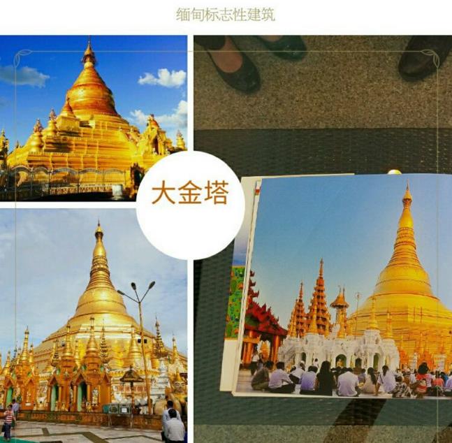 缅甸标志性建筑------“仰光大金塔”。(又称瑞光大金塔或雪德宫大金塔)高98米,塔底座周长427米,塔顶有做工精细的金属罩檐,檐上挂有金铃1065个,银铃420个,并镶嵌有7000颗各种罕见的红、蓝宝石钻球,其中有一块重76克拉的金钢钻。塔身经过多次贴金,上面的黄金巳有7000公斤重。塔顶全部用黄金铸成,上有1260公斤的金属宝伞,周围嵌有红宝石664颗,翡翠551颗,金刚钻443颗。整座塔金光闪烁,雍容华贵,雄伟壮观。
