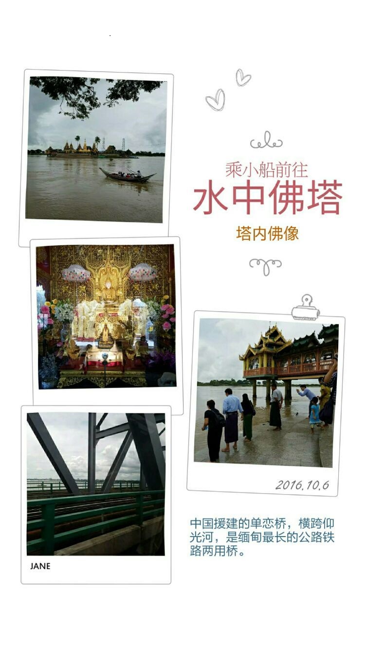 水中佛塔是位于远离仰光的一个乡村上,在仰光要乘将近2小时小车,途中经过一座由中国无偿援建的公路、铁路两用的单恋大桥,是目前缅甸最长的跨仰光河大桥;再乘小船才到水中佛塔,佛塔依河畔而建,塔内供奉的是贴满金箔的玉佛。