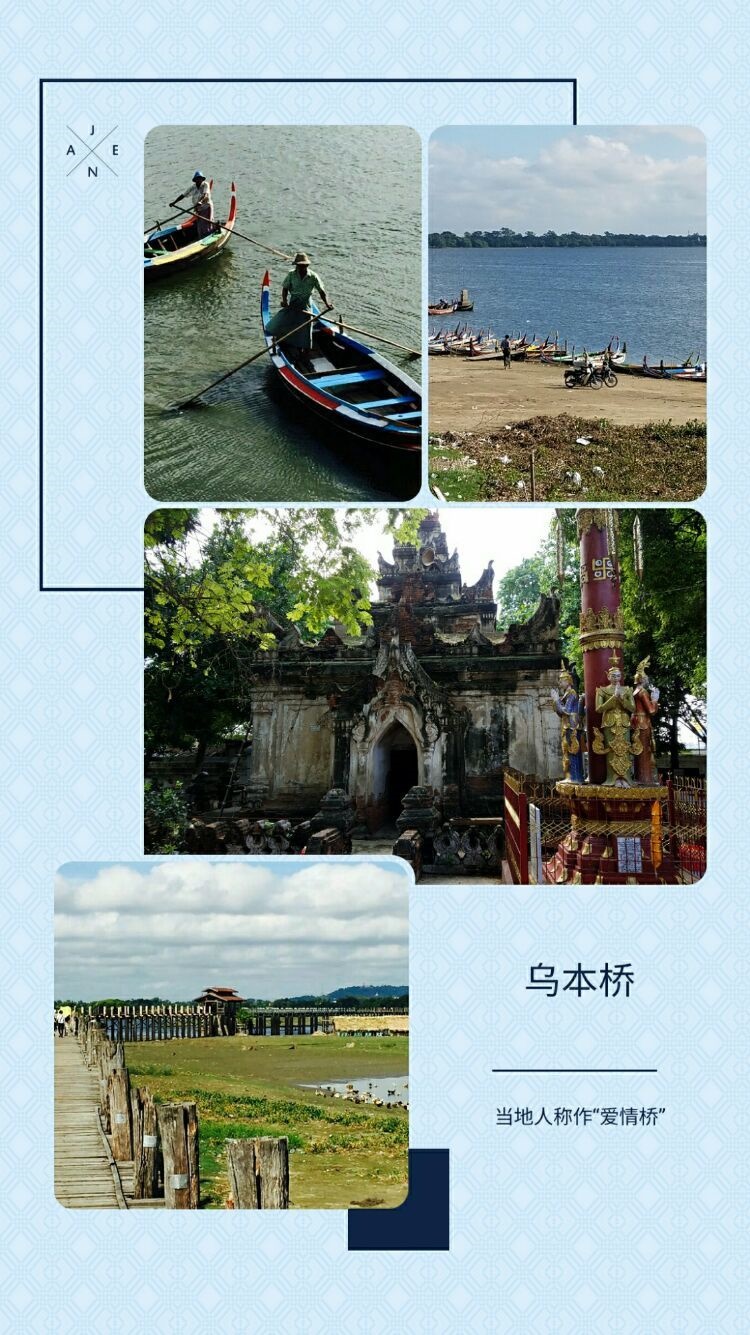 10月10日上午到乌本桥。该桥建于1851年,长达1200米,由1086根实心柚木建造而成,是世界上最长的柚木桥,最重要的是,当初建桥的木材全部来自拆迁的阿瓦王宫。桥头、桥中和桥尾分别有6座亭子,这体现了佛教的“六种精神”。当地人又称“爱情桥”,恋人会不远千里来登此桥,祈求永保六种和睦互敬精神。