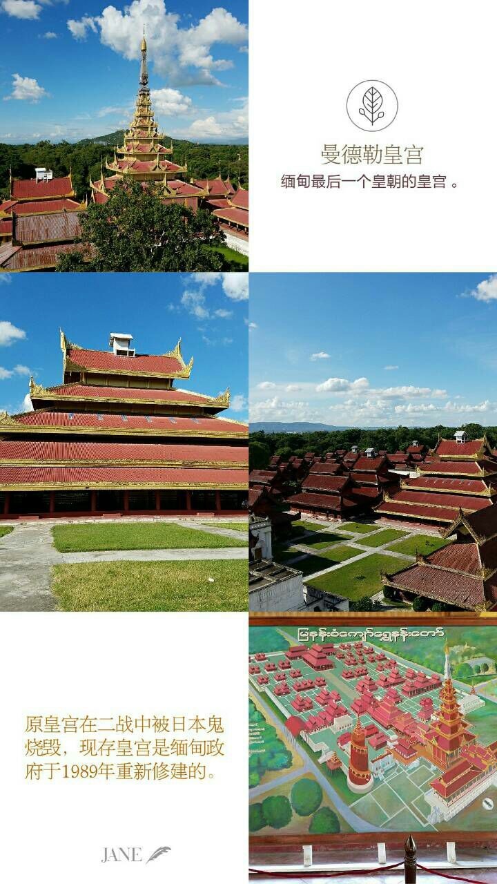 曼德勒皇宫是缅甸最后一个王朝“贡榜皇朝”的皇宫,1859年建成。整个皇宫呈正方形,为木结构的建筑,宫内大大小小有104座庙宇,建筑以红色为主。在二战中被烧毁,缅甸政府于1889年进行重建,现时只恢复部分历史胜景。