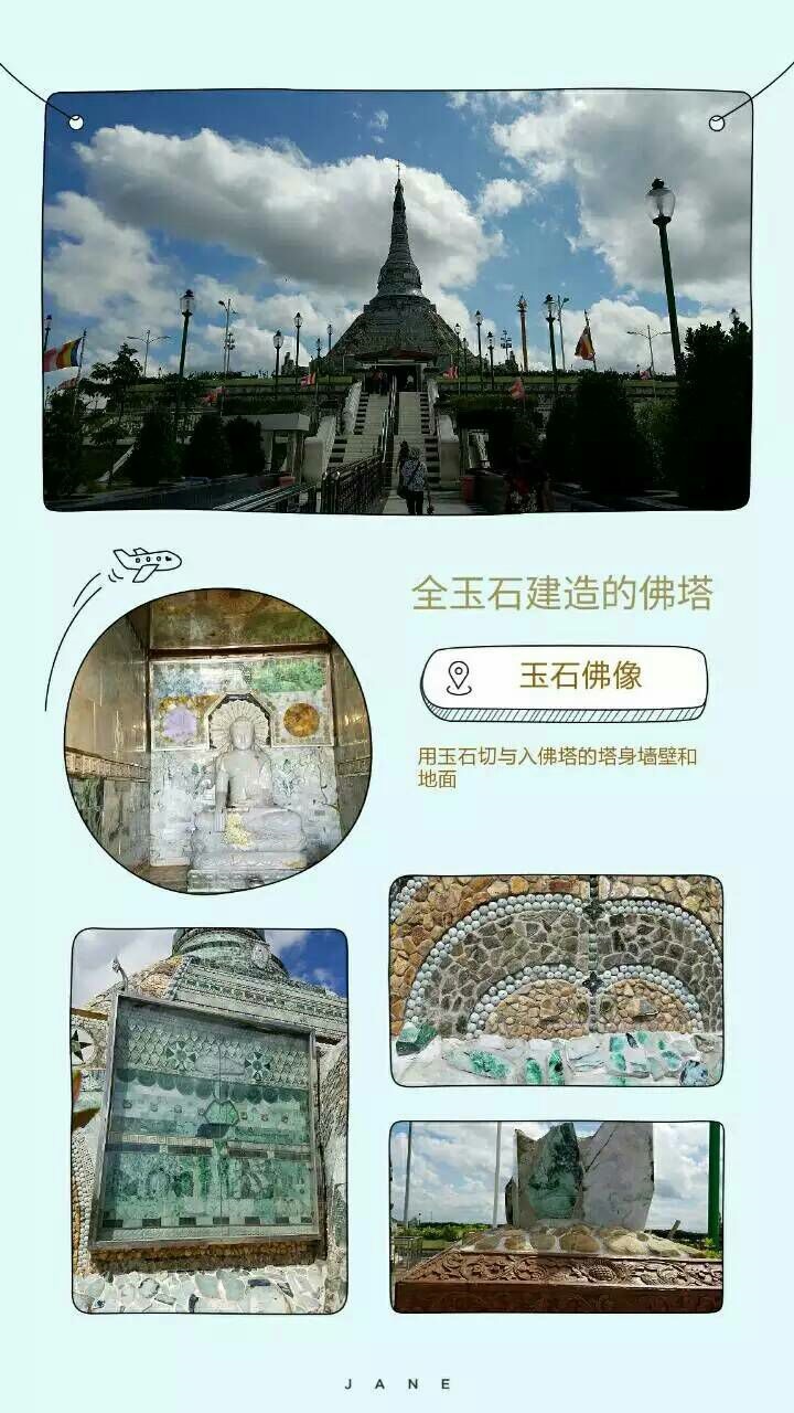 玉石佛塔。是由一位经营玉石的华人将自己毕生收藏的玉石,其中不有价值不非的翡翠、紫罗兰等名贵玉石全部捐献出来修建的一座佛塔,整座建筑全部用玉石砌成,包括佛像、塔身、地面等,没有一根木头和钉子,是全世界唯一的一座玉石佛塔。