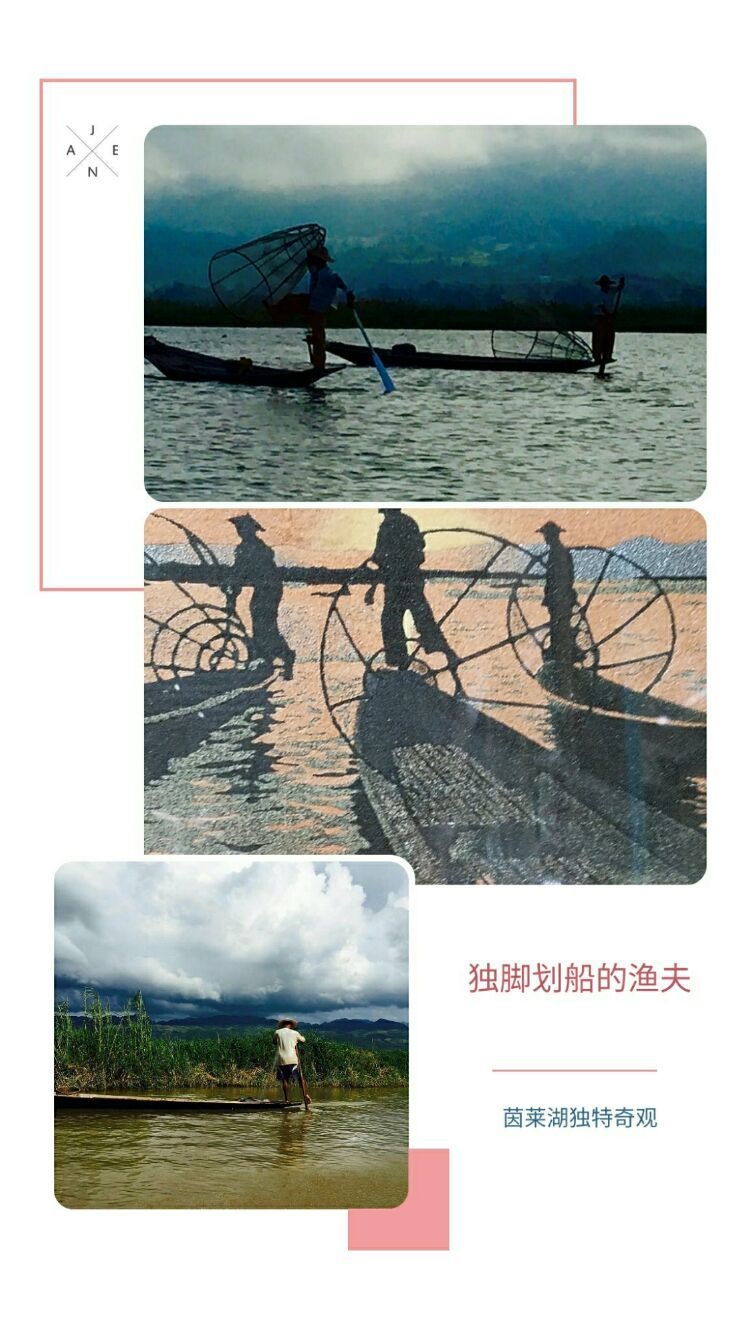 茵莱湖渔夫用1只脚划着小小的木船在湖中打鱼,形成独特的捕鱼方式。