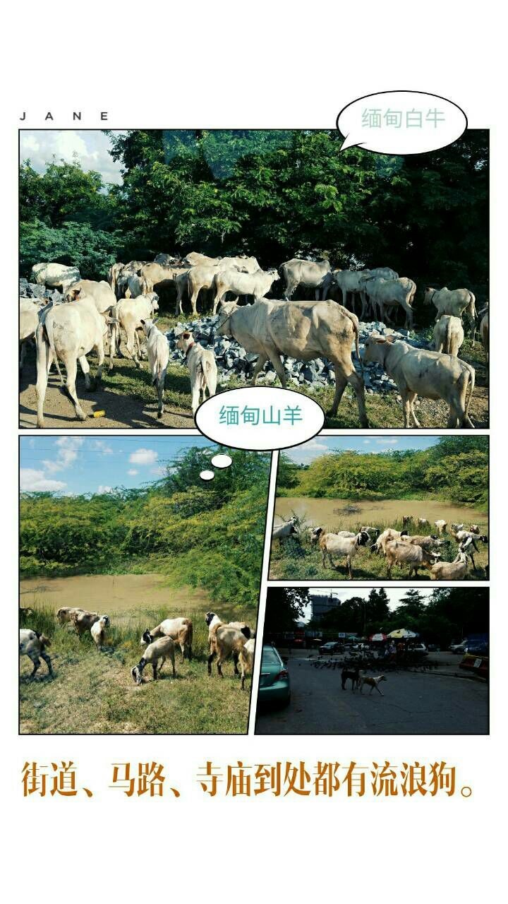 缅甸地多人少,无论平原或山区树木繁盛,草地丰富,但饲养的牲畜很瘦。主要有白牛、山羊,有些可以用骨瘦如柴来形容,流浪狗随处可见。