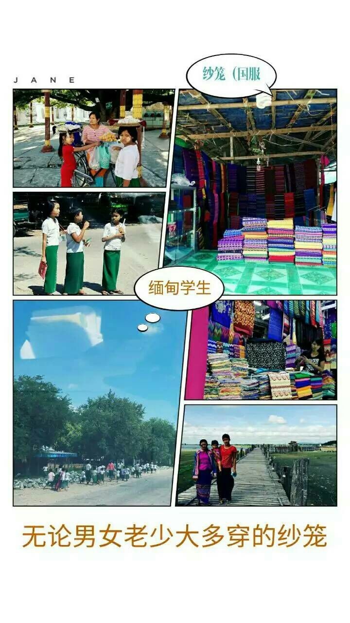 缅甸国服--------“纱笼”。穿上身好似长直筒裙,无论男女老幼大部分都穿(出家人除外),因而到处都有纱笼摆卖,男士大多穿方格或静色的,而女士则色彩艳丽,花色繁多,学生不分男女统一穿绿色的。
