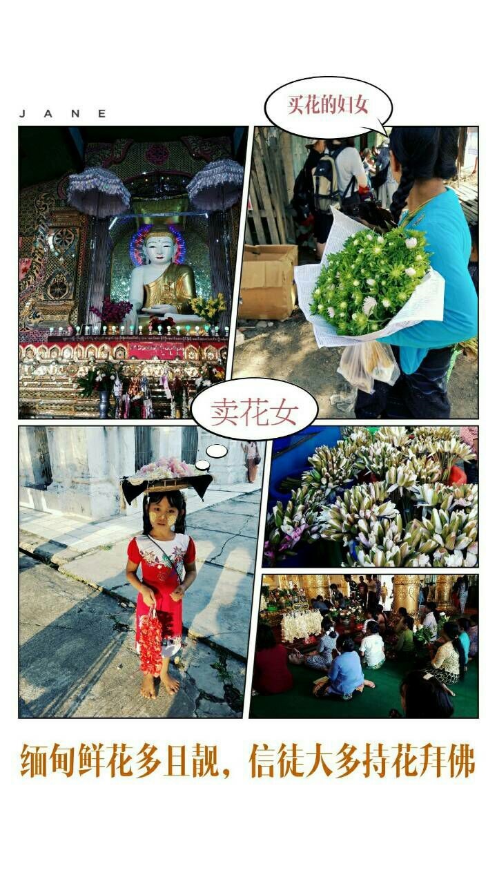 缅甸各种鲜花很多,而且非常新鲜,路边和寺庙傍摆满卖花摊档供信徒购买供奉在佛像前。