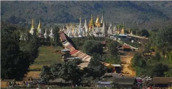 集市后边的小山坡上有座佛寺,虽然大殿并不宽敞,但围绕寺庙的是众多的白塔,从远处看去相当宏伟。缅甸是佛教国家,在茵莱湖也不例外,不仅湖边一圈有不少佛寺。