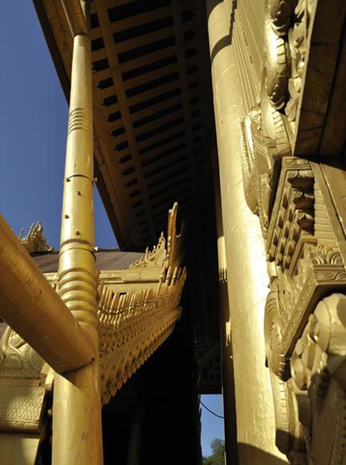 可以看出重建是很认真的,材料也都是选用以前缅甸皇家建造房屋的柚木。宫殿广场上的房屋层层递进,分为东西两片,东片住着男眷,西片住着女眷,两部分之间的金銮殿,层层的屋顶让这座建筑看起来气势恢宏。而皇宫内有一个不错的观景点,是一个高三十三公尺的瞭望塔,爬上一百二十一级楼梯后,便会鸟瞰整个皇宫及曼德勒市的景色。得利于缅甸的气候,皇宫以及整座城市都被绿色的树木环绕,显得生机盎然。