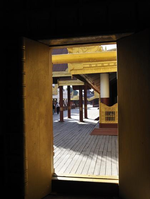 在曼德勒的城市中央,是缅甸的贡榜王朝的皇宫所在地。当我们穿过了城市熙熙攘攘的街巷,抵达皇宫的时候,视野便豁然开朗。宽阔的护城河对面是皇宫低矮的城墙,隐约也能够看见城墙内黄红相间的成片屋顶,汽车围着护城河开了一周,整个皇城面积为4平方公里,呈正方形。规模虽不能和故宫相比,但也完全不失皇家的气派。