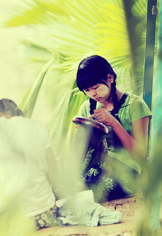 缅甸妇女和儿童涂抹在脸上的“特纳卡”常常是用心勾绘的,而不仅仅是简单的涂擦。比较常见的图案有圆形的、方形的,还有很多涂绘成好看的树叶形状。栩栩如生的一片漂亮的黄色树叶覆在脸上当真是非常的动人。请教当地朋友,这种脸部“特纳卡”的“制作工艺”倒也不复杂,如果绘画功底不到家,只要就地取材用形状好看的树叶为模具涂上“特纳卡”,覆印在脸上即可。