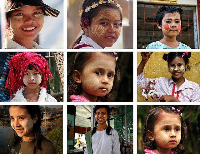 曼德勒的乌本桥、“马哈伽纳扬僧院”的千人僧饭,茵莱湖的独角船夫和水上佛寺等等,都是在旅行者的相册中出镜率最高的图片拍摄地。还有一道不能被忽略的景观,那就是缅甸的美女个个都是“花脸猫”。