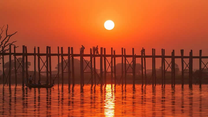 乌本桥的落日很美,美得平和温暖,不带一点点哀伤或是落寞。站在乌本桥上看落日,有回到诗词画中的丝丝感受,远处天空中残阳如火,从水面直烧到天际,给四周全部涂上一层金红。此时会觉得远处的枯树与小船,如同漂浮于画中。偶尔还会听到吉他弹出的动人旋律和相伴的缅语歌声。