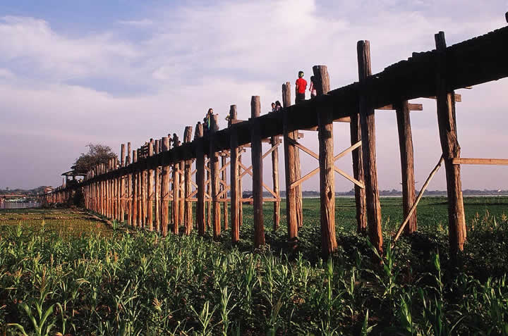 乌本桥全长1600米,宽约2米,是世界上最长的木桥之一。桥柱与桥柱之间相距3米远,桥柱有1000多根。整座桥相接处没有使用一颗铁钉,全靠斗榫。这座桥已经历经一百多年的风风雨雨,但是依然结实。