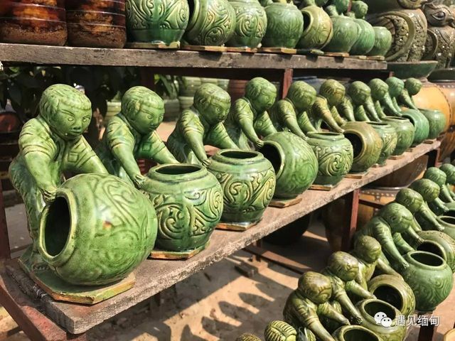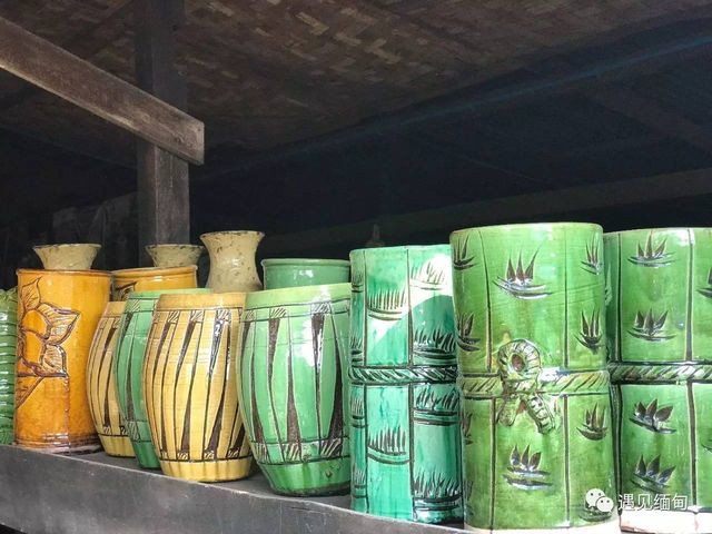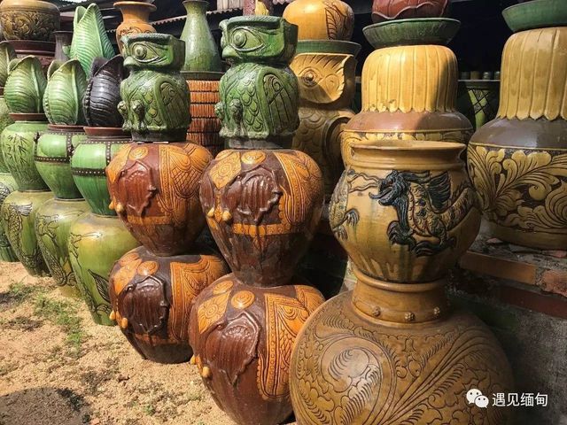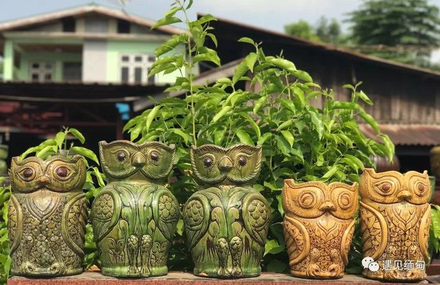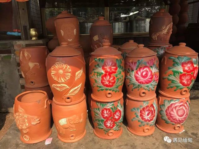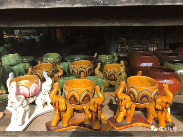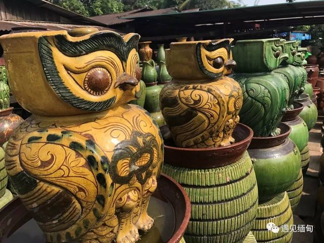 缅甸土陶有很多品种,有缸、罐、碗、杯、盆、壶、瓶等日常生活用具,也有供陈列摆设的彩釉工艺品。颜色有墨绿、浅绿、中黄、淡黄、褐色、灰白、黑色、红色等,陶器上所绘的图案有花卉、瑞兽、传统缅甸图腾纹,陶器多塑成猫头鹰、大象等动物形状。