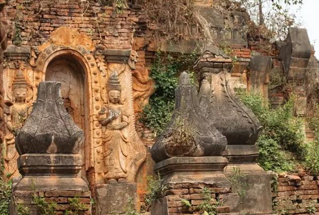大部分佛塔上精美的雕像犹在,塔身却已倾颓,且有着修补的痕迹。显然是岁月一边冲刷侵蚀,历朝历代的人们一边查漏补缺,且又不断在旁树起新塔,如此层层叠叠,交错蔓延而成。