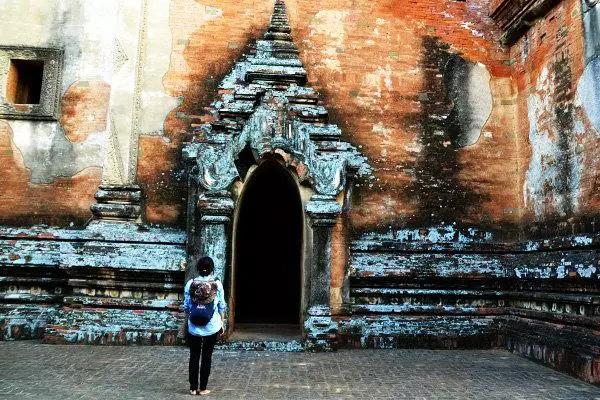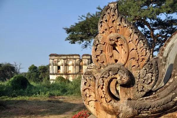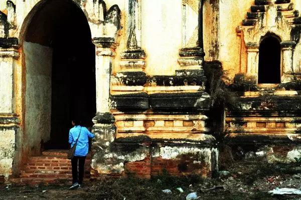 从瑞西光塔大寺出来,已经是最后一抹余晖。迷失方向,不知是出了哪个方向的门,眼前是一条乡村土路。犹犹豫豫地走了几步,突然梦老师低低的惊呼:“呀!”——两座古迹斑驳,造型奇峻的砖塔耸立在民居和树林之间,一大一小。只在一瞬间,我们就浸泡在浓郁的时光里面。两头白牛在树下反刍,鸡在地上刨食,穿着笼基,头顶一筐蔬菜的妇人路过,与我们相视微笑,我颔首对她道一声:“鸣个喇叭”,她的笑意更深,回一句问候,与我们擦肩而过。我们绕着大塔转了两圈,塔基面积不小,这是一个小型古堡状的塔,白墙已部分被岁月染墨,很多地方墙皮剥落,露出砖,砖缝里生出杂草,高低错落十几个塔尖拱卫着主塔尖,四面有高大的门,门券火焰纹装饰,天色愈暗,塔门里黑黢黢,隐约看到有佛像。——旅行中最有意思的,是邂逅,在这里我们邂逅了时光,陈旧的印记,其实是时光高贵的勋章。但这两座塔只是蒲甘众塔中非常普通的两座,我甚至连它们的名字都没有查到。