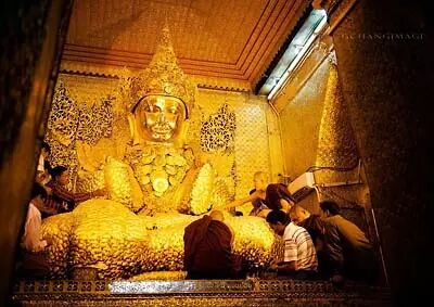 马哈牟尼的佛像据说是全缅甸最著名的。虔诚信众贴上去的、衍生成蜂巢状的金箔块已经覆盖了佛像面部以外的所有区域。况且每天还有无数的金箔等待着被贴上去。