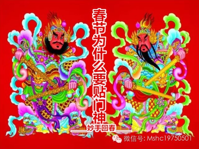 我国各地过年都有贴门神的风俗。最初的门神是刻桃木为人形,挂在人的旁边,后来是画成门神人像张贴于门。