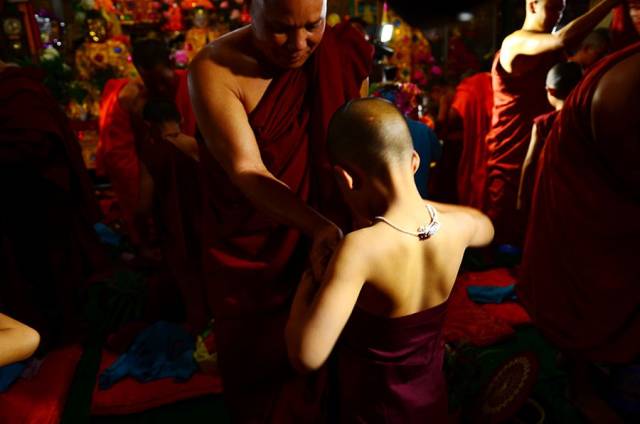 在奘寺大殿内,高僧为即将出家的孩子加持授袈裟。