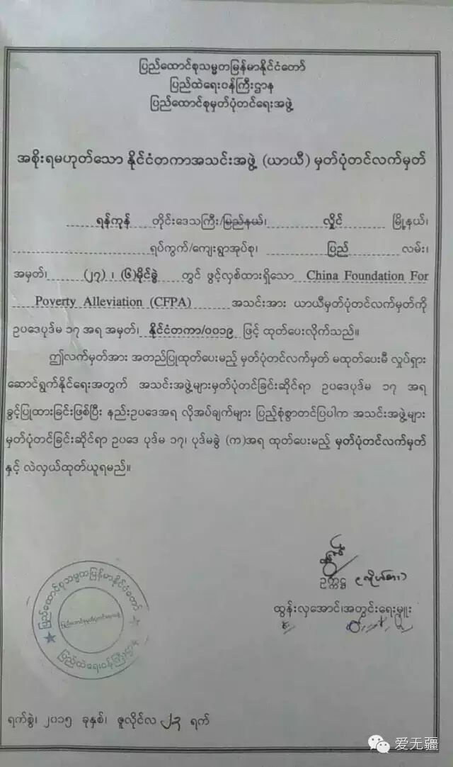 根据我国国际非政府组织注册法第十七条,特批准位于仰光Pyay road 27, 6.5miles Hlaing的中国扶贫基金会成为我国正式注册的国际非政府组织,注册号码为10019。