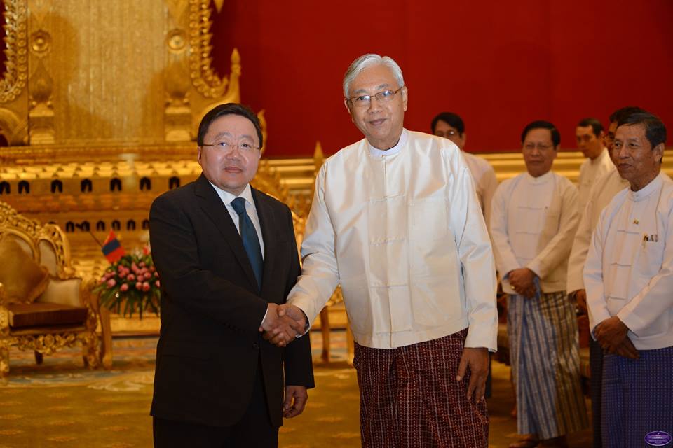 正在缅甸访问的蒙古国总统H.E.Mr.ELBEGDORJT Tsakhia 6月15日下午2时前往内比都总统府拜会国家总统吴廷觉及国务资政杜昂山素季。