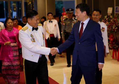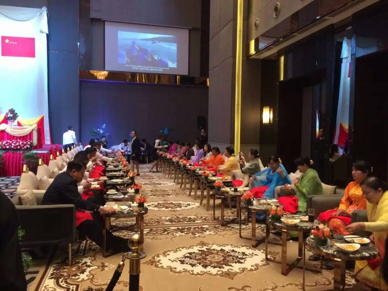 中国驻缅甸大使洪亮、缅甸国防军副总司令兼陆军司令梭温二级大将率国防军总司令部9名高级将领、缅甸政府代表宣传部长培敏博士、警察总监佐温警少将和仰光驻军领导、各国驻缅使节和武官团成员、联合国驻缅机构代表、缅社会各界人士、华人华侨、中国留学生及中资机构代表、中国驻缅使馆外交官等共约450人出席了招待会。