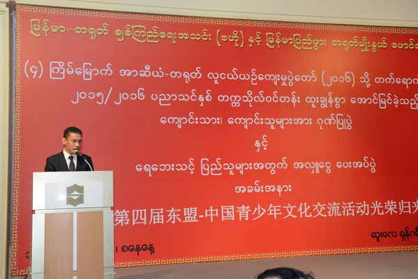 中国驻缅甸大使馆陈辰公参、缅甸政府教育部教育司长吴觉双伦、缅华基金会董事长赖松生相继在会上致词,他们强调青少年国家的未来,少年强则国家强,同时祝愿共同促进缅中友谊更上一层楼。