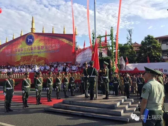 开幕式上,举行了庄严的升国旗仪式。随着两国国旗护卫队庄重的升旗礼仪,鲜艳的中国国旗、缅甸国旗先后飘扬在广场上空,现场全体领导、嘉宾、边民起立向双方国旗致敬。中缅两国的国旗缓缓升起,中国•瑞丽第十六届中缅胞波狂欢节正式拉开帷幕。