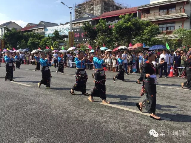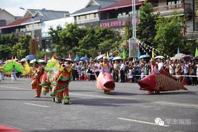 现场一片欢乐祥和,彩旗飘扬、热闹非凡,中缅两国各族人民身着华美的民族服饰,跳着优美的舞蹈,打起欢快的鼓点,组成了12个别具民族风情的方阵进行巡游。