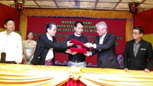 座谈会后,缅甸中华总商会和新加坡企业代团团长代表双方签定合作协议。仰光省区行政长官(省总理)吴飘民登及中华总商会副会长和新加坡企业代表团副团长见证了双方合作协议签定仪式。