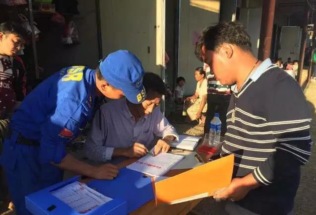 图为队员协助工作人员进行边民临时身份卡登记和发放工作