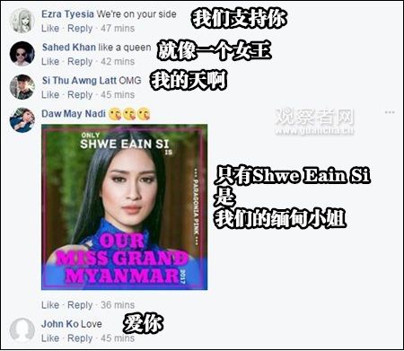 “是的,Shwe Eain Si制作了一段关于在若开邦武装分子传播恐怖统治的视频,这对她成为一名选美小姐的形象有害。作为缅甸公民,她应该利用自己的名望去说出这个国家发生的真相。”