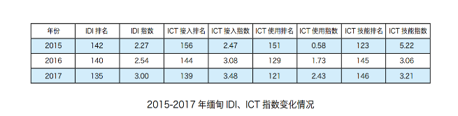 近期,联合国国际电信联盟(以下简称国际电联)发布的一项调查显示,缅甸在信息通信技术(ICT)领域的发展距印度仅剩一步之遥。未来如果缅甸能保持这一增长势头,该国的信息通信技术发展指数(IDI)很可能会超越印度这一亚洲老牌信息技术强国。(IDI指数是衡量各国家和地区信息通信技术发展水平的综合评价指标,从ICT接入、ICT使用以及 ICT技能三个维度,选取11个分项指标加权计算得出)。