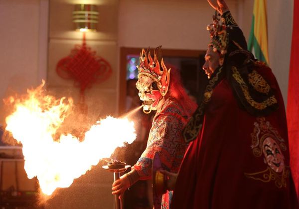 招待会上中缅两国艺术家联袂表演了传统舞狮、功夫茶、杂技、川剧吐火变脸和民族舞蹈等精彩纷呈的文艺节目,赢得现场观众掌声不断、喝彩连连。洪亮大使夫妇陪同来宾观赏花灯,参加趣味游园活动,观看中国传统文化展示,并共同品尝中缅特色美食。