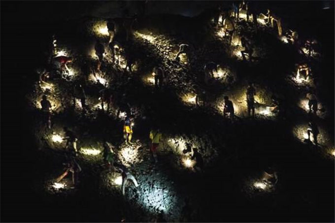 非法矿工打着手电筒在采矿公司的尾矿堆中寻找翡翠,不论白天还是晚上,总有矿工在工作。挖玉人晚上打灯寻找一块梦寐以求的翡翠。