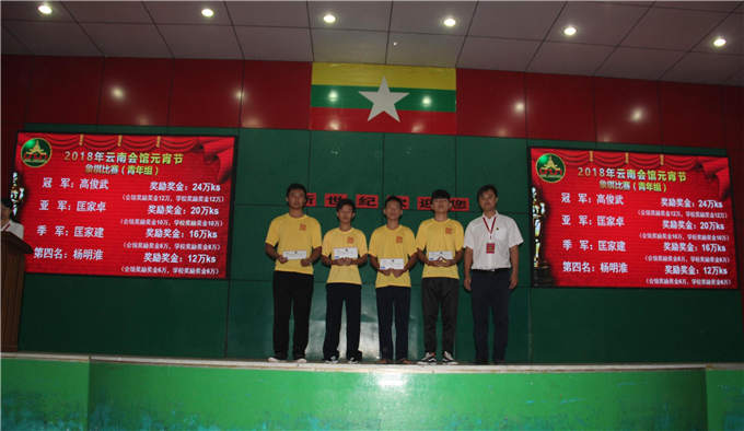 文体活动颁奖典礼由幼稚园余波园长主持,为在今年元宵节文体比赛中获奖的同学颁发了几万到几十万不等的奖金。文娱比赛中,传统舞蹈第一名《茉莉花》的苏瑞敏、晏柔彤、李岱庭、常定贤、鲁德丽、李明珠、姜吉蕊、美相、孟磊、杨宝琴、尚清菁、杨薰薰、吴佳佳、毛建星、李翠芝、马新爱、赵叶新、张瑞琪、李娅婷、汤彩娇、汤彩霞、杨谨慈、杨玉珠23位表演者获得奖金78.5万缅币;民族舞蹈第三名的《隆达梅朵》的杨建馨、玉芬、贾嘉玲、曹娅睿、杨新好、王恩龄、鲁雨菲、尚利娜、官芹爽、汤燕君、李明月、李娅秋、陈国松、陈生蕊、刘佩淇、尚利株、尚明明、杨春玲、何安平、李映和20位演员获得奖金58万缅币;少儿舞蹈《拍拍手》的杨仕君、黄正琳、玉洁、相玉静、陈馨怡、玉芳、杨贵媛、陈国江、尚应欣、王箐、杨于萱、杨凯妮、毛家美13位小演员获得奖金16万缅币;歌唱比赛第三名的张瑞琪同学获得奖金40万缅币;体育比赛中,乒乓球比赛获少年组和青年组单打冠亚军、青年组双打亚季军的宝大伟、蒋仁祐、阙开豪、杨恩灿四位同学分别获得奖金20万缅币、15万缅币、15万缅币、10万缅币;象棋比赛少年组斩获冠亚军的匡家楼、常定旭两位同学,分别获得奖金20万缅币、16万缅币,包揽象棋青年组前四名的高俊武、匡家卓、匡家建、杨明淮四位同学,分别获得奖金24万缅币、20万缅币、16万缅币、12万缅币。颁奖典礼上,同学们不断为获奖同学报以热烈的掌声。
