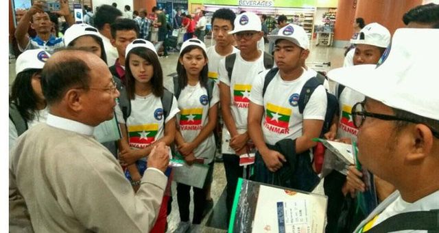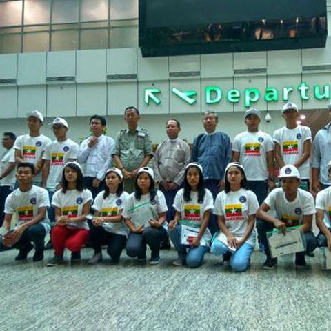 该十四名学生在缅中友好协会常务理事吴盛纽带领下,于3月30日中午乘机离仰,缅中友协副会长吴梭温及理事们以及学生家长们到仰光国际机场送行。