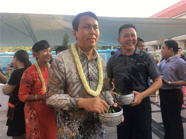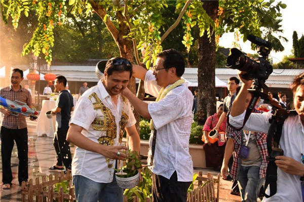 活动现场气氛热烈,嘉宾互相泼洒福水,享受着节日乐趣,共同祝福中缅两国和两国关系更加美好的未来。