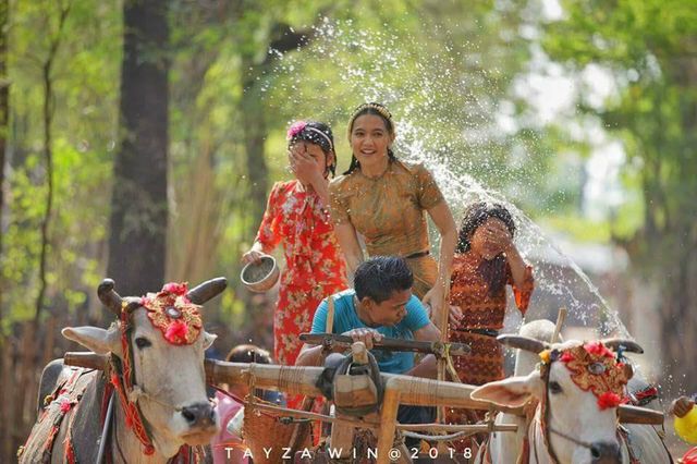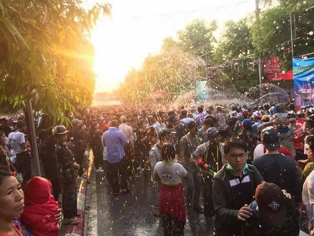 ▼今年仰光首次推出步行泼水节,提倡文明泼水。图为“苏丽公园”旁的“公园路”步行泼水街
