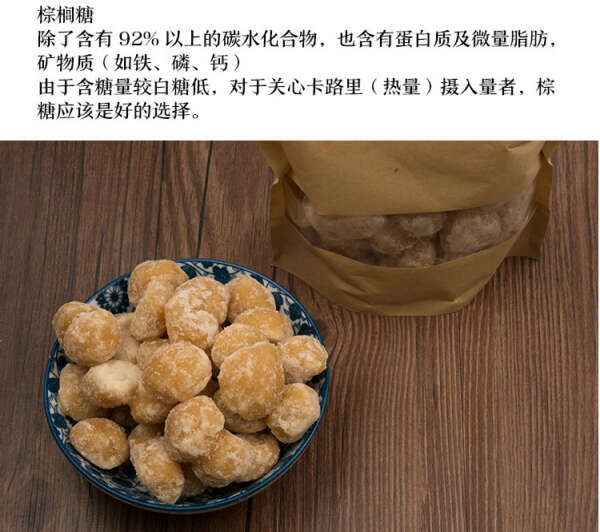 棕榈树提供的甜点食品也为现代人类所忘怀了——现在人们认为由甘蔗提供的白糖才是甜点食品的来源。栽种甘蔗时需要耗费大量的水资源,还需要大量的化肥和农药。由甘蔗制糖的过程中还消耗了大量的能源,并且对环境也有一定的污染作用。但由棕榈树所得的棕榈糖,在其酿制过程中不需要任何化学物品。棕榈糖中含有大量维生素B,并含有丰富的矿物质——铁、镁、钾等。在民族医药物中,棕榈糖就占有一定的地位。