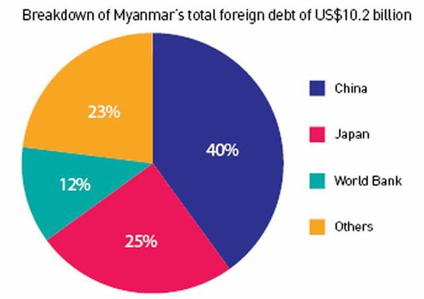 报道称,截至3月31日,缅甸欠了21个外国和机构共102亿美元(约合702亿元人民币),这还不包括由亚洲开发银行额外提供的4050万美元(约合2.7亿元人民币)农业贷款。