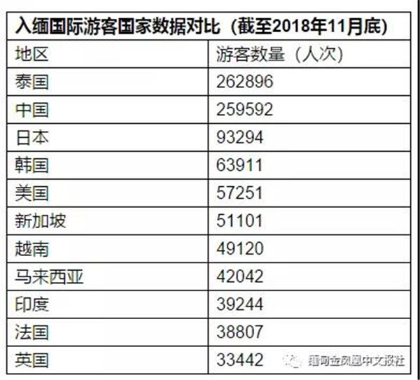 据统计,截至2018年11月底,入缅游览的国际游客数量的前三位国家非别是泰国、中国和日本,在这当中,泰国游客入缅262896人次,中国游客259592人次,日本游客93294人次。其中,中国游客同比增加38%,泰国游客同比增加7%。